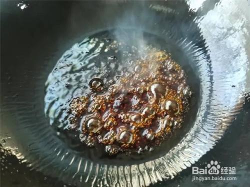 将油倒出,留少许底油,下入冰糖,将冰糖快速的敲碎,敲散。用小火继续搅动冰糖让冰糖完全的变成液态的形状。在炒糖色的时候全部使用小火,这样做会慢一些。在炒糖色的时候一定要不停的搅动糖。冰糖融化后先冒大泡,然后慢慢变成黄色小泡,随着温度继续升高,黄色小泡变成黄色沫子,继续加热,颜色变成枣红色,这时会闻到焦糖的香味,糖色就炒好了