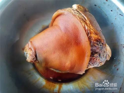 把肘子捞出后,沥净水分,放到盆内,趁热,把肘子四周都抹上红烧酱油,给肘子上色