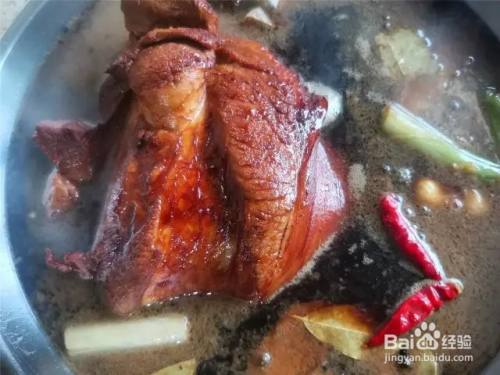 马上淋入开水,千万不要淋冷水,那样会溅油,容易烫伤手臂,下入肘子,水量能没过肘子就可以了,再加入盐、葱段、姜片、花椒、大料、香叶、干辣椒、料酒、红烧酱油、生抽酱油,大火烧开,盖上锅盖,转小火炖制1小时,期间,把肘子翻2-3次面