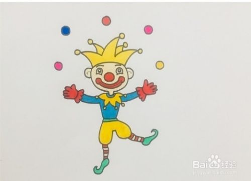 首先画出杂技高手的帽子,往下画出他的头部和五官,再画出杂技高手的身体,他的手臂是张开的,一只脚抬起来,然后给他的帽子涂黄色,上衣涂绿色,裤子涂黄色,鼻子和嘴巴涂红色,一个杂技高手就画好了。