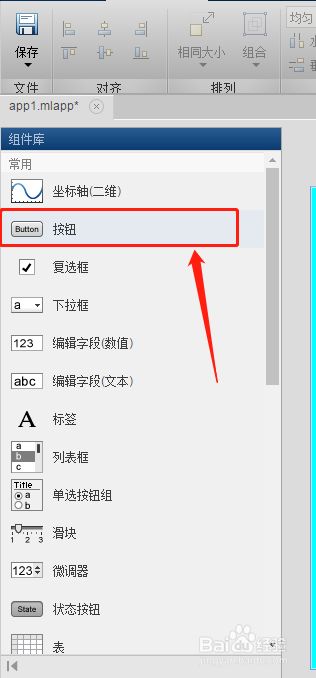 在App Designer的设计界面中,在设计视图下选择组件库中的按钮组件