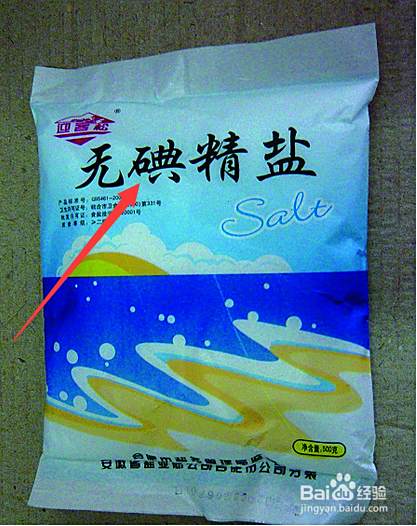 一、看包装。碘盐是加有碘的盐。如图中箭头所指就是写有加碘,那就是碘盐。