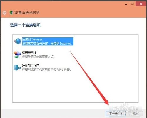 进入后选择一个连接选项下面点选连接到internet,点击下一步。