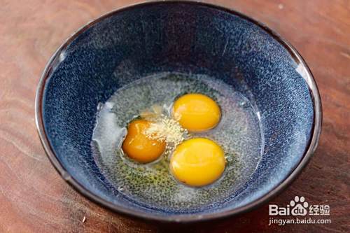 鸡蛋打入碗中,加入适量的盐和1克鸡精,胡椒粉和料酒调味,用筷子搅拌均匀。