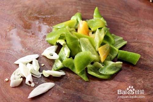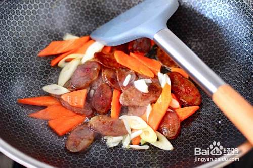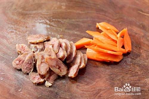 胡萝卜用刀切成菱形片,腊肠斜切成薄片。