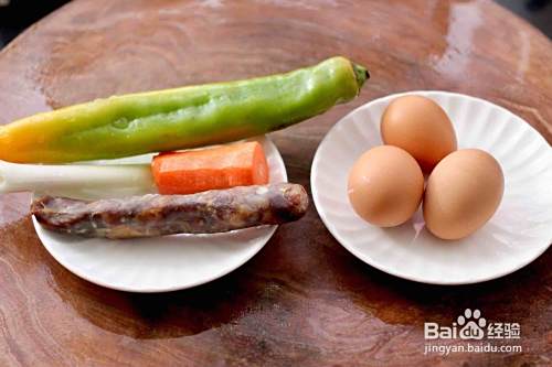 首先备齐食材,腊肠提前蒸熟,胡萝卜洗净去皮。