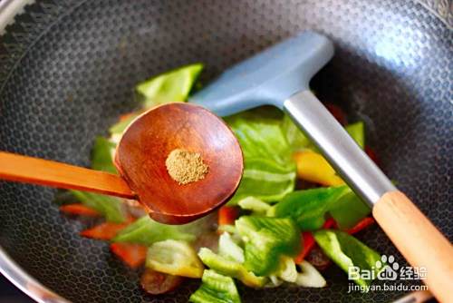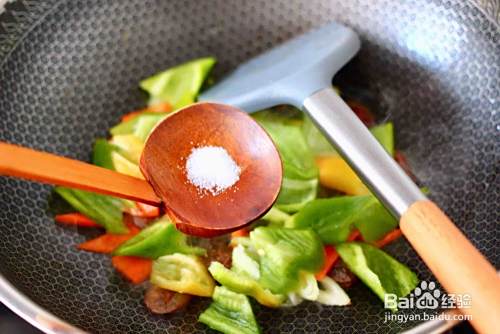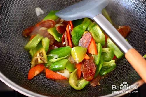 ,油锅烧至7成热,放腊肠炒10秒,放姜蒜片炒香,加洋葱炒至断生,最后加鸡精炒匀即可。