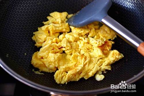 锅烧热倒入10克花生油烧热,把打散的鸡蛋液倒入锅中炒熟盛出。