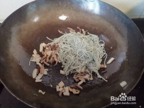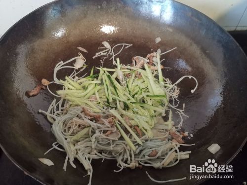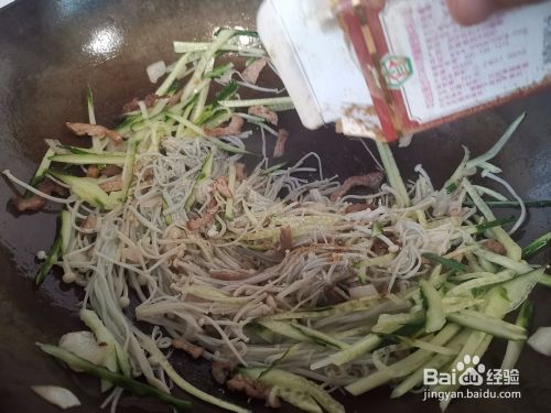 然后下入焯过水的金针菇,翻炒均匀后,倒入切好的黄瓜丝继续翻炒