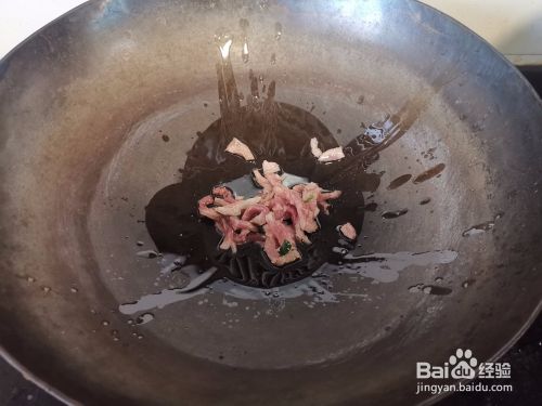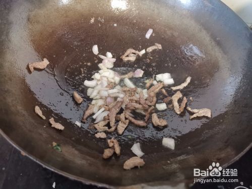 猪肉丝下锅炒香变色后,放入洋葱段炒香