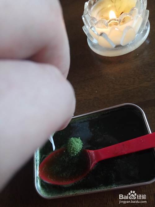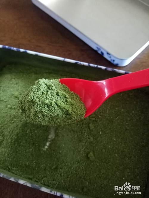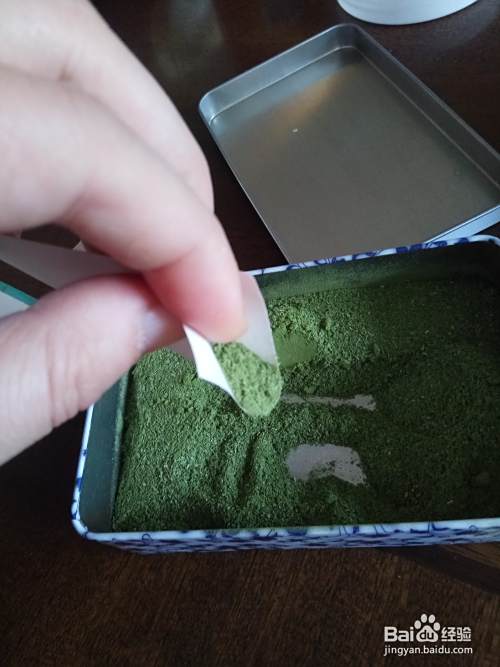 然后加两勺,柿子叶粉,用一个干净的勺子,进行搅拌,使其均匀,