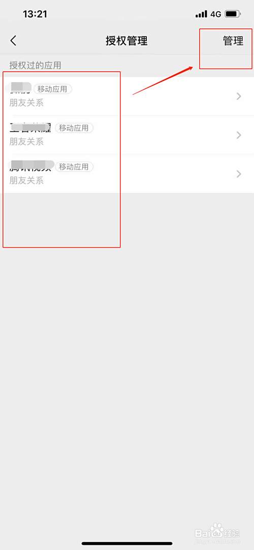 在这个页面就可以看到当前微信授权过的应用软件信息啦,如果要进行删除,点击右上方的管理即可。