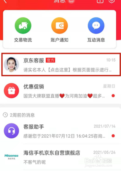 在消息界面点击京东客服。