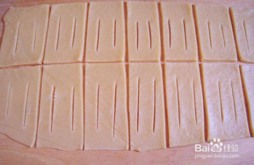 给四边用刀切掉。用刀结成1.5到2寸的长条在面条中间在划两刀口。