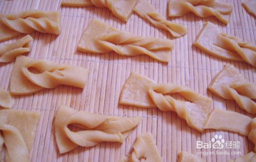 然后拿起面条一头从中间的划口处翻出来,即可将面放到面板上擀成薄片,切成一条一条的,每条斜切成小三角。