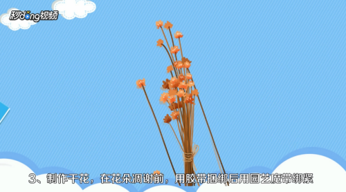 4制作干花,在花朵凋谢前,用胶带捆绑后,用园艺魔带绑紧,然后末端再转几圈,固定成一个挂钩,吊在通风处静置一个月后,就变为干花了。