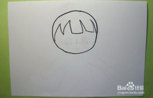 用铅笔在白纸上画出草稿,Q版人物的特点是头部很大,眼睛很大,一般都是可爱的造型,用笔先画出一个大的圆形,作为Q版人物的头型,如下图所示。