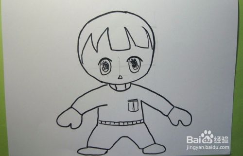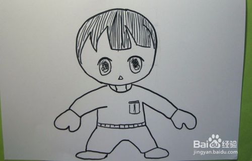 最后,用笔给人物的头发涂上颜色,人物的服装上画出口袋,这样就更加生动了,如下图所示。大家按照步骤也来画画吧。
