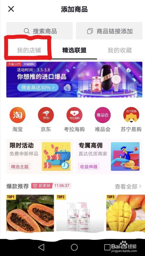【重点】进入选品页首页,点击“我的店铺”