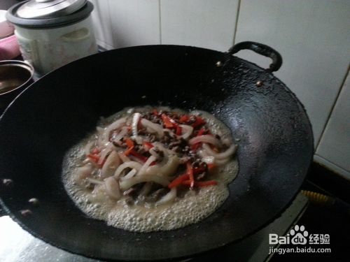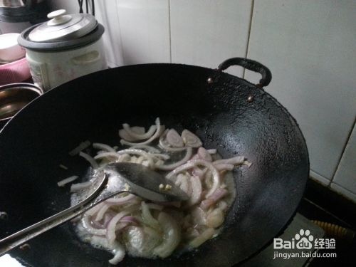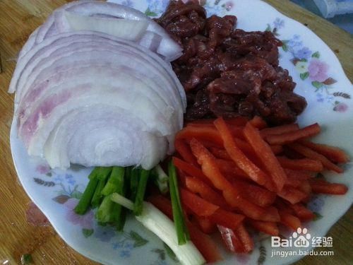 牛肉切丝,洋葱和红辣椒切条,香葱切成段,生姜少许切成丁