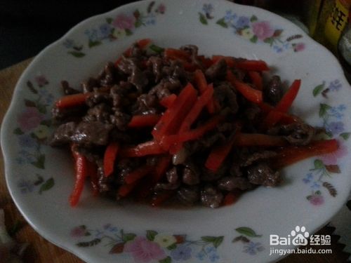 加入半成品牛肉和红辣椒,一起翻炒,点上盐,香喷喷的生爆牛肉就可以出锅啦