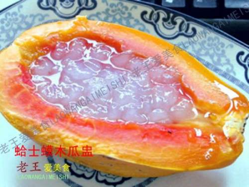 3炖好的雪蛤盛入木瓜盅里,盖上瓜盖放在大的容器里;上蒸锅隔水中火蒸炖10分钟,出锅连同木瓜一起食用。切记要用中火和温火,以保存其营养成分。