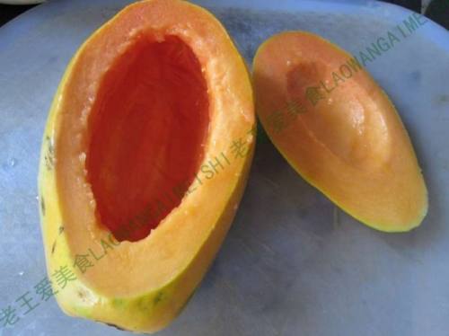 1准备好一个木瓜,沿瓜的2/3横线切开,掏空瓜籽和白膜;为了美观,刀口也可切成锯齿状。切下来的瓜可以当盖子。