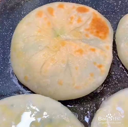 最后平底锅里倒上适量食用油,油热放入馅饼,小火慢煎煎至两面金黄,皮薄馅大的馅饼就做好了。