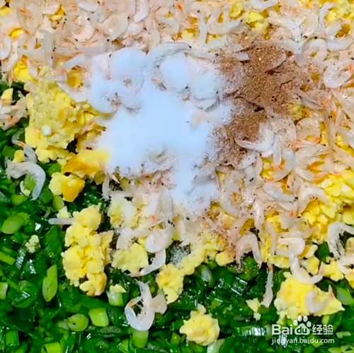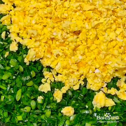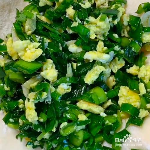 再准备适量韭菜摘洗干净切碎,加上适量食用油,拌匀,倒上鸡蛋碎。