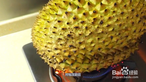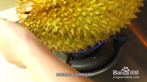 将燃气灶打开,设为小火,将榴莲放在上面烧制外壳。