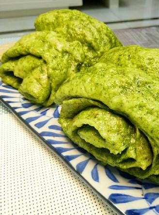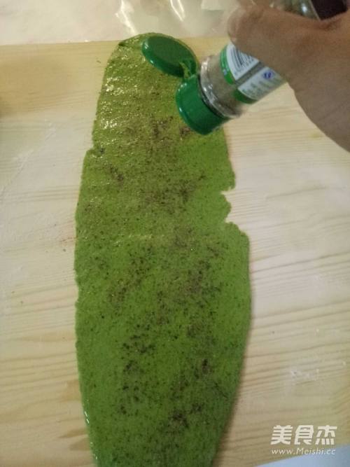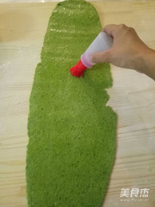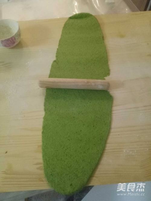 5、把发酵好的菠菜面团排气揉匀,醒发10分钟左右。擀成薄片。