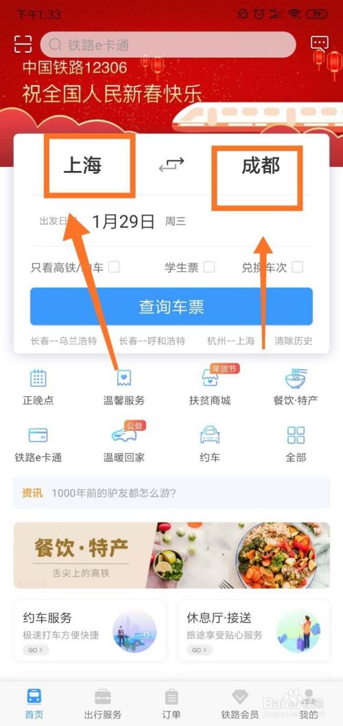 登录后,我们在首页的顶部编辑出发地和目的地,点击进入;