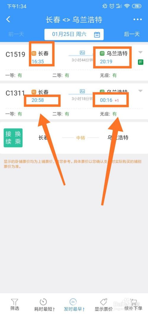 接下来进入软件自动查询,筛选后,我们在底部可以点击“耗时最短”或者“发时最早”排列车票,如果没有想要的时间段,点击换乘,也能查询出换乘的车票,中间都有标注时间;