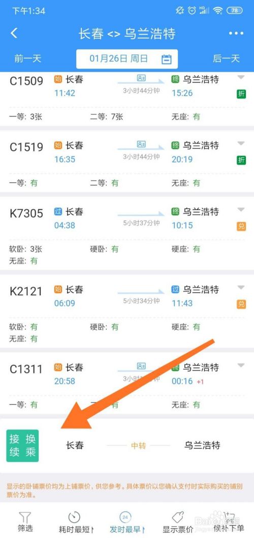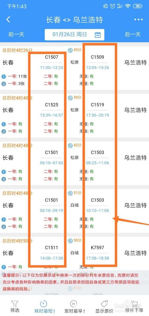 这样软件就会搜索出长春到乌兰浩特市的火车票,在每趟列车票上面都有标注时刻表,从几点出发到几点到达;