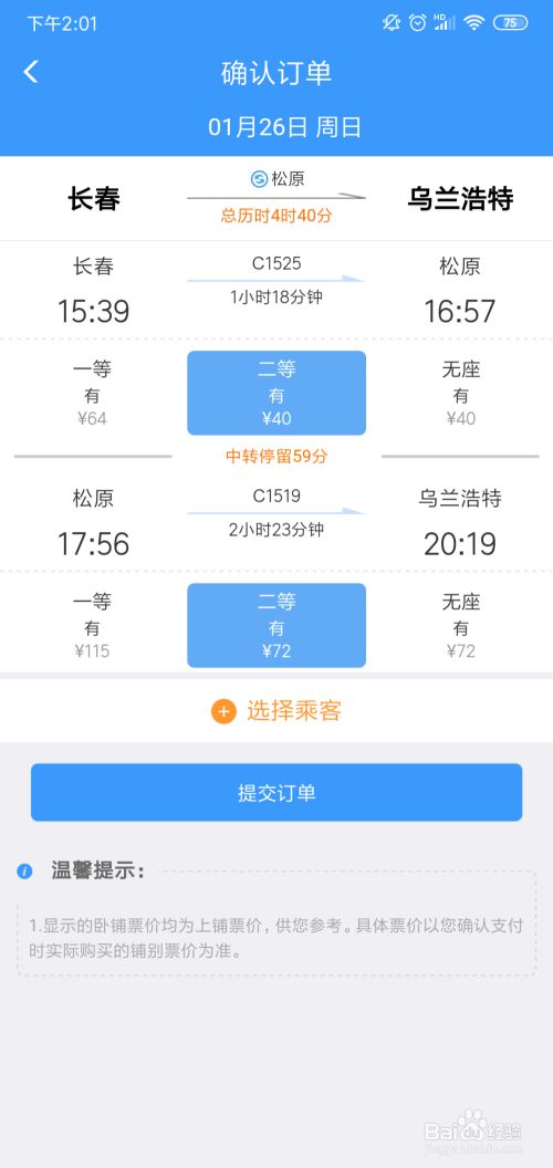 点击一张车票打开,我们能看到具体的时间段,如下图从长春出发到松原换乘,中间有停留时间,再到达乌兰浩特市,选择好后添加乘客,提交订单就能买票。