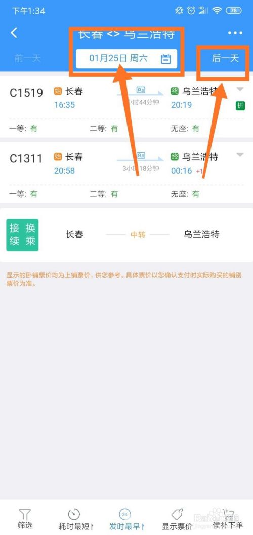 如果要查询其他日期的车票,我们可以点击右上角的“后一天”,或者点击日历图标,选择我们的出发日期,点击查询车票;