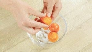 金桔中倒入少量食盐,用手搓洗金桔表面。