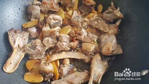 爆姜的时候,把一些鸭皮之类的油多的也一起放上去出油。同上,一直爆到鸭皮表面焦黄看着不肥了。感觉也炒了很久的样子,另一边自己忙自己的事,时不时看几眼。