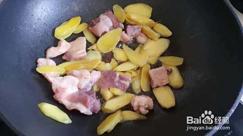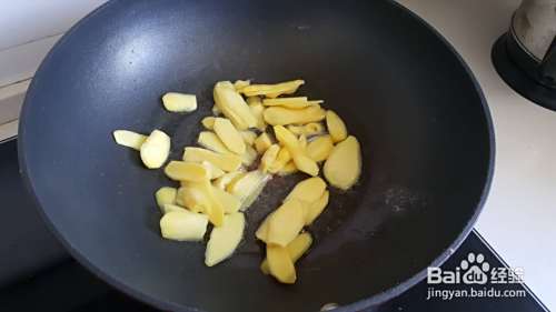 爆姜。倒了不少油,放姜。小火大火中火时不时翻一翻,爆到姜表面出现焦黄才行,一定要这样,不然姜根本不好吃也不入味。