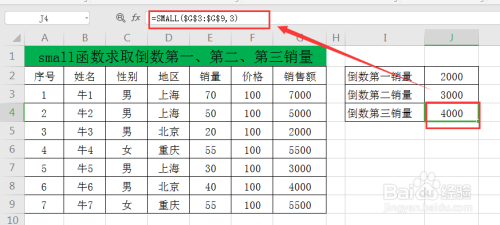 点击J4单元格,输入公式:=SMALL($G$3:$G$9,3),得出倒数第三销量为:4000(如下图)