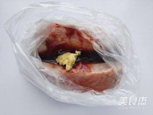 4将叉烧酱3勺、蚝油1勺、黄酒1勺、酱油1勺、冰糖10克、姜茸5克和梅肉一起放入保鲜袋里;