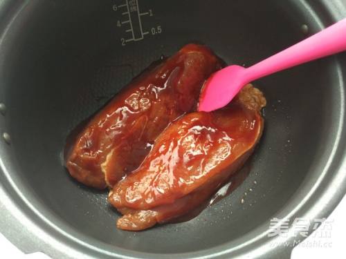 6将腌制好的梅肉放入苏泊尔鲜呼吸压力锅内胆里,加入剩下的2勺叉烧酱,均匀地抹在肉在表面;