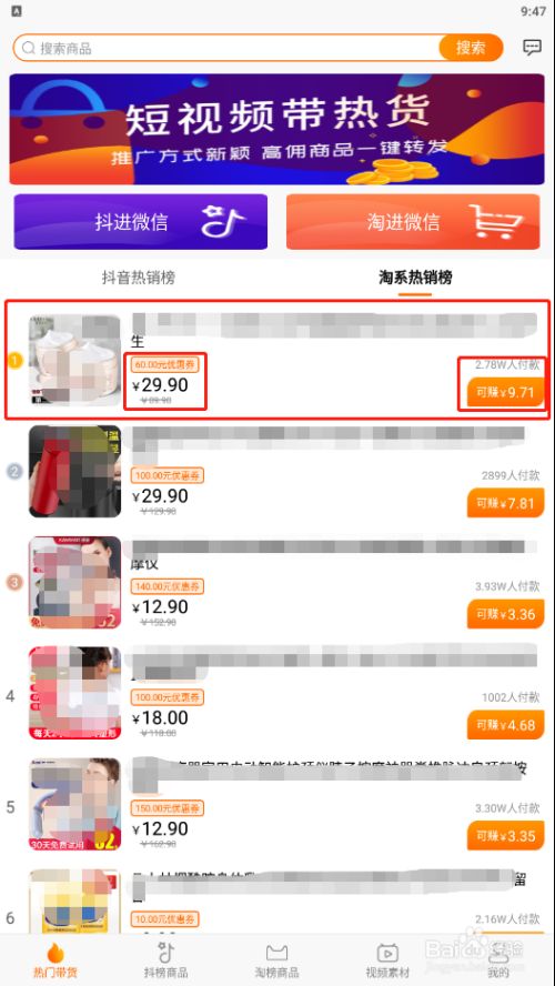 在主页面可以看到分为抖音商品和淘宝商品两个平台,也是目前我唯一看到过能赚抖音带货商品佣金的APP。首页上直接就是两个平台目前最热卖的商品,选择起来比较方便。