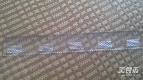 9拿出刚刚我要的尺子吧,你们要是有模具,那自己拿模具压好就行。没有模具的朋友听我号令:量好圆的直径,取好饼干的适量长度宽度,我觉得长4~5厘米比较好。如果想要花边,用尺子的波浪线压割,可以用直线边。并插小孔