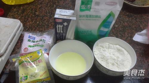 1准备好以上的材料。盐我用的是深井海藻加碘盐,挺好的。普通食用盐也可以的。今天买的小苏打。最好用纯牛奶。