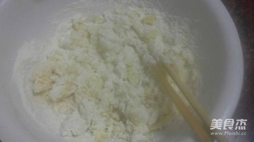 5用筷子搅拌一下,成了絮状。现在你就可以下手去揉了,不用加水。家里有面包机的朋友们省省吧,饼干面团很干的,面包机揉不动哒~自己努力吧。(不用担心啦~因为面团很干,所以不会粘手的)
