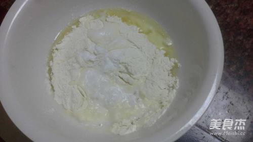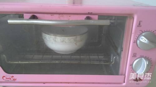 3加热之后的牛奶倒入4克泡打粉(或酵母)。搅拌均匀。牛奶不可以太烫酵母菌会烫死,如果是锅子加热的话,牛奶温度最好30℃,如果外面太阳大,可以直接太阳晒热~哈哈