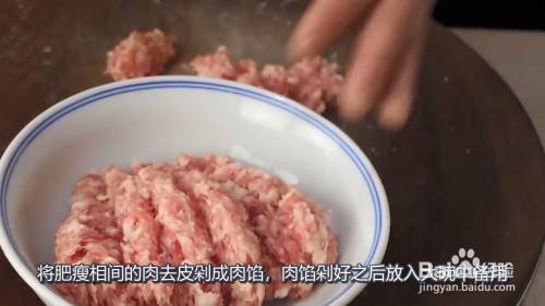 将肥瘦相间的肉去皮剁成肉馅,肉馅剁好之后放入大碗中备用。
