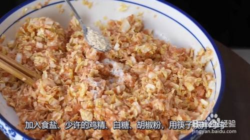 把肉馅倒入白菜里面,搅拌均匀之后开始调味,加入食盐、少许的鸡精、白糖、胡椒粉,用筷子搅拌均匀。
