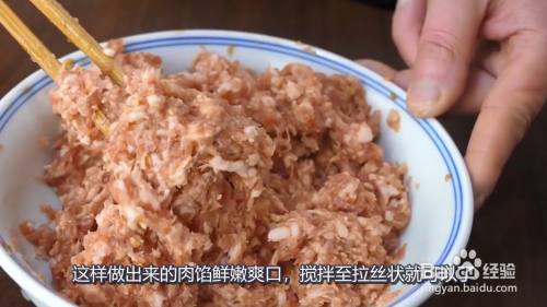用筷子搅拌均匀,朝着一个方向搅至上劲,这样做出来的肉馅鲜嫩爽口,搅拌至拉丝状就可以了。